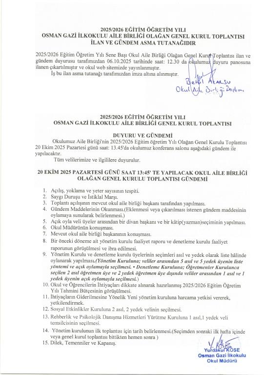 Milli Eğitim Bakanlığı Okul- Aile Birliği Yönetmeliği’nin 7-(1) Maddesine göre okul yöneticileri, öğretmenler ve veliler Okul- Aile Birliğinin tabiî üyesidir. Okul Aile Birliğimizin yıllık Olağan Genel Kurul toplantısı T.C. Milli Eğitim Bakanlığı Strateji Geliştirme Başkanlığı’nın 15/10/2020 tarih, 14890597 sayı ve Okul Aile Birliği Toplantıları konulu resmi yazıları doğrultusunda 20 Ekim 2025 Pazartesi günü saat 13.45’da, aşağıdaki gündem maddelerini görüşmek üzere okulumuz konferans salonunda yapılacaktır. Okul – Aile arasındaki bütünleşmenin gerçekleştirilmesi, veli ve okul arasındaki iletişimi güçlendirmesi, eğitim – öğretimi geliştirici faaliyetlerin desteklenmesinde büyük anlam taşıyan, bu toplantıya tüm velilerimizin katılımını bekler, sağlık ve mutluluklar dileriz.